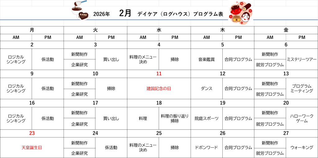 2月のホップアップデイケアとしゅう吉のプログラムです。